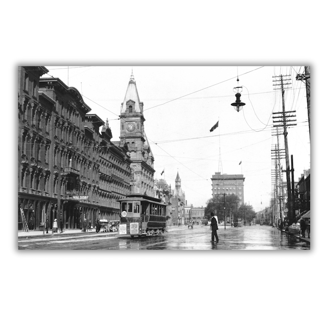 1907 print showing King St. looking west from Catharine St. Downtown Hamilton had a special charm as can be seen with the streetcar in front of the Waldorf Hotel (later the site of the Royal Connaught) and the horse & buggy off in the distance.